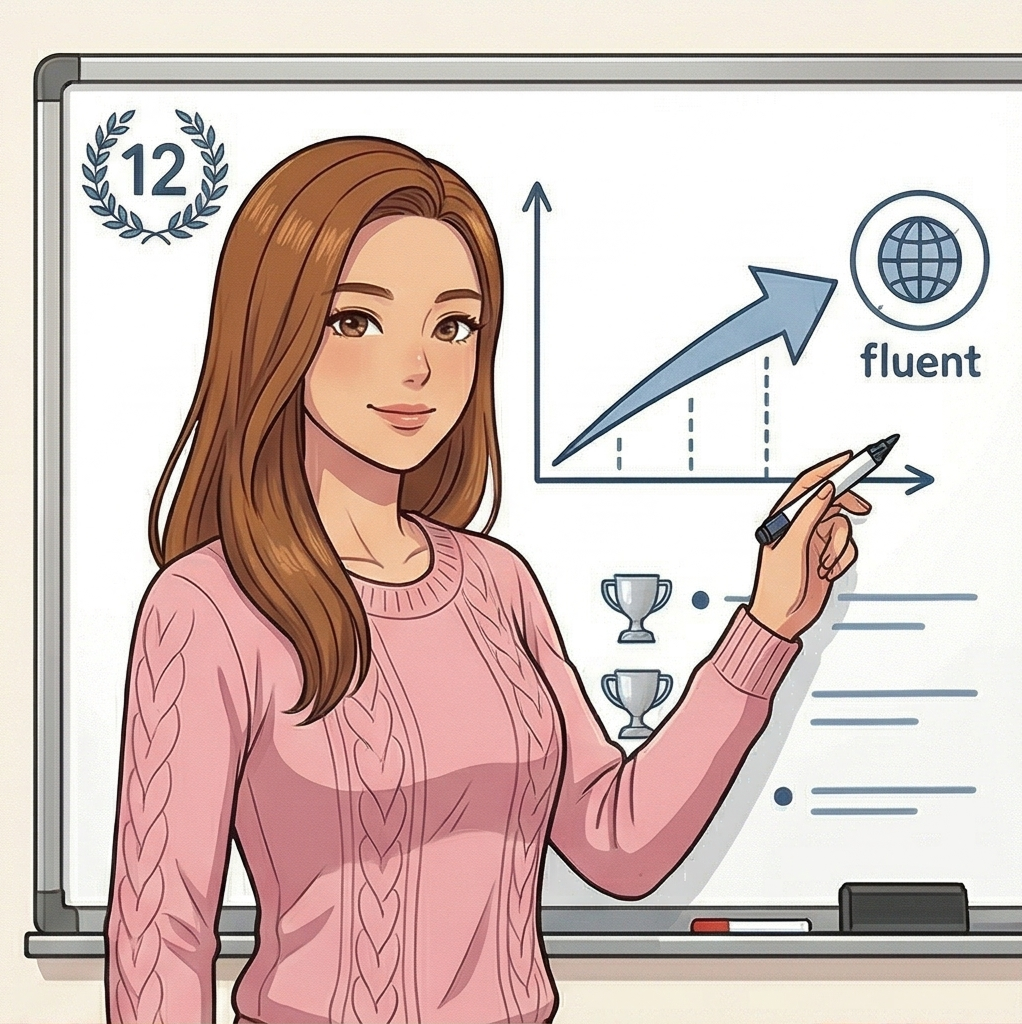 「間違えることは、話せるようになるための第一歩です。私と一緒に、恥ずかしがらずにたくさん間違えましょう!」